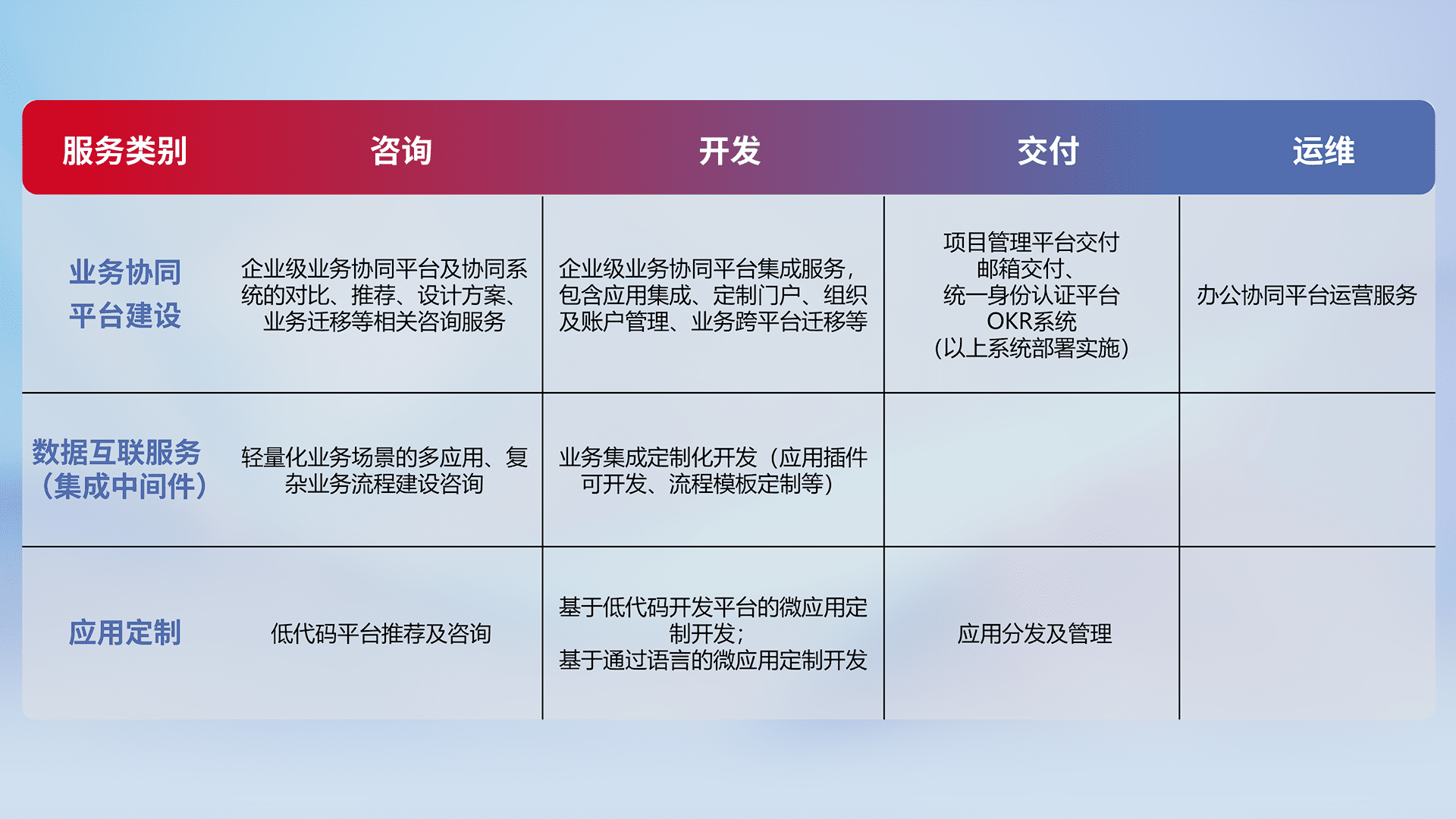 针对钉钉、、、企微、、IDaas等平台级产品提供产品的规划、、、、方案、、交付、、定制化开发等服务,,实现如统一协同办公、、、、智能客户服务、、、混合会议管理、、、、智能数据查询、、、、等业务场景,,,,实现数字化转型。。。