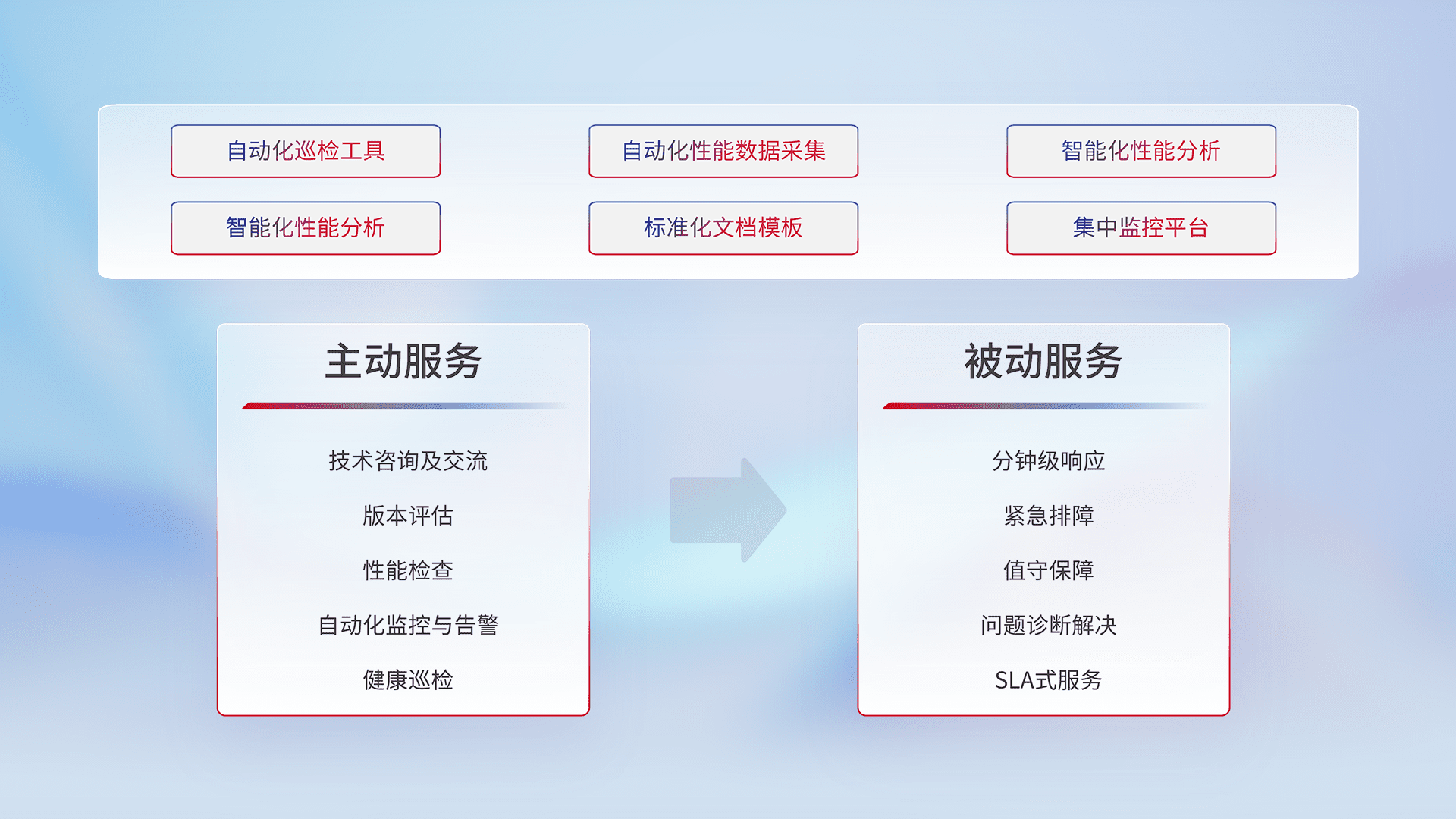 智能化工具和标准化文档,,,,保障服务质量,,提供主动服务(包含技术咨询、、、、版本评估、、性能检查、、、自动化监控与告警、、健康巡检)和被动服务包含(分钟级响应、、、、紧急排障、、、、值守保障、、、问题诊断解决、、、、SLA服务)。。